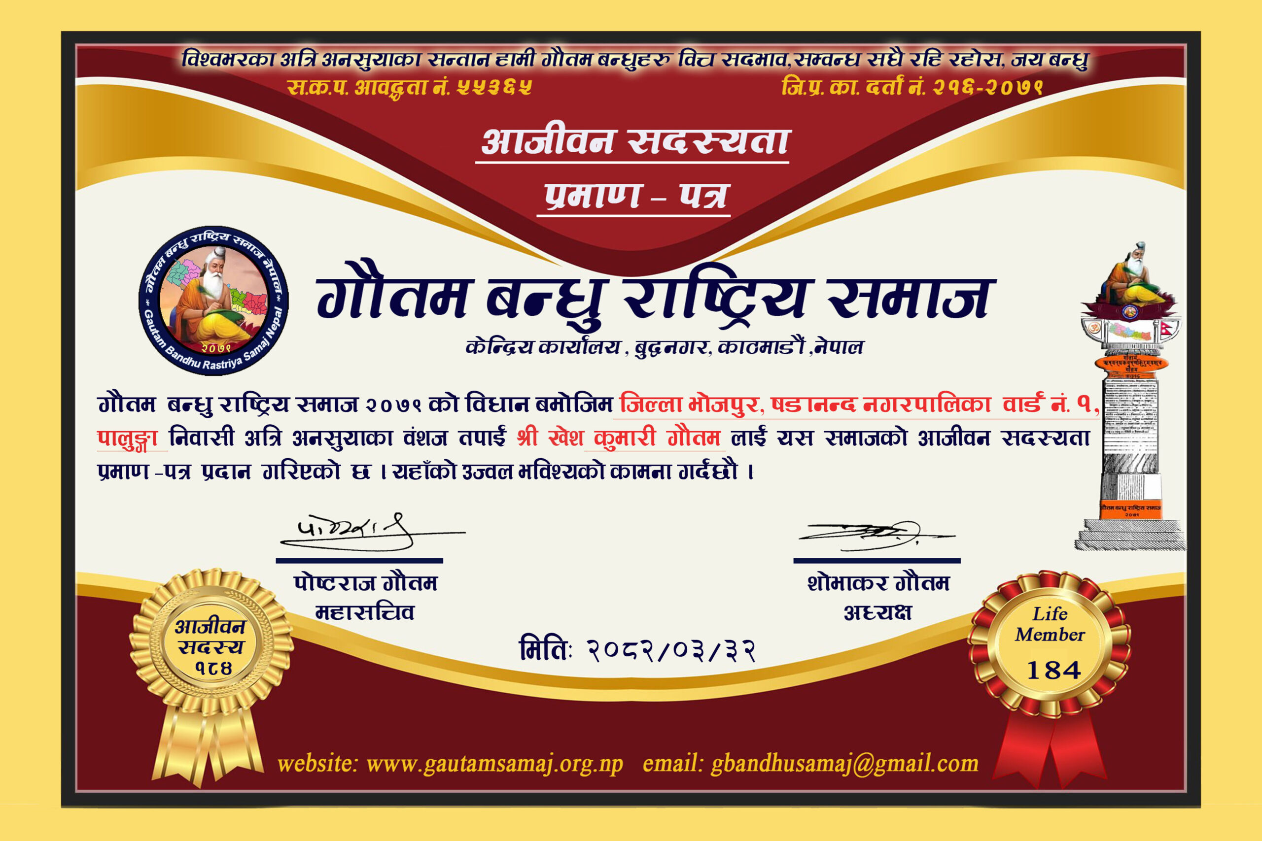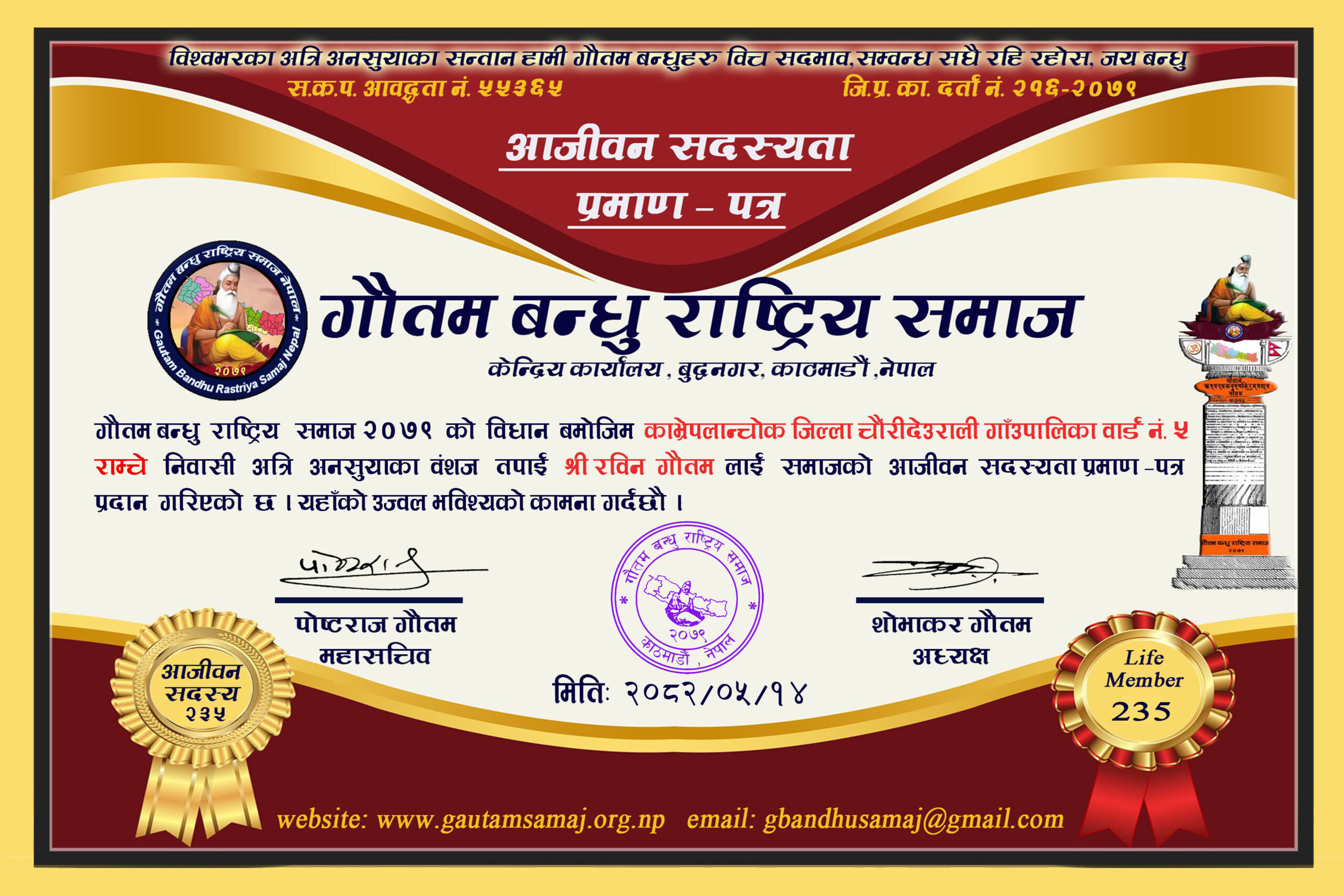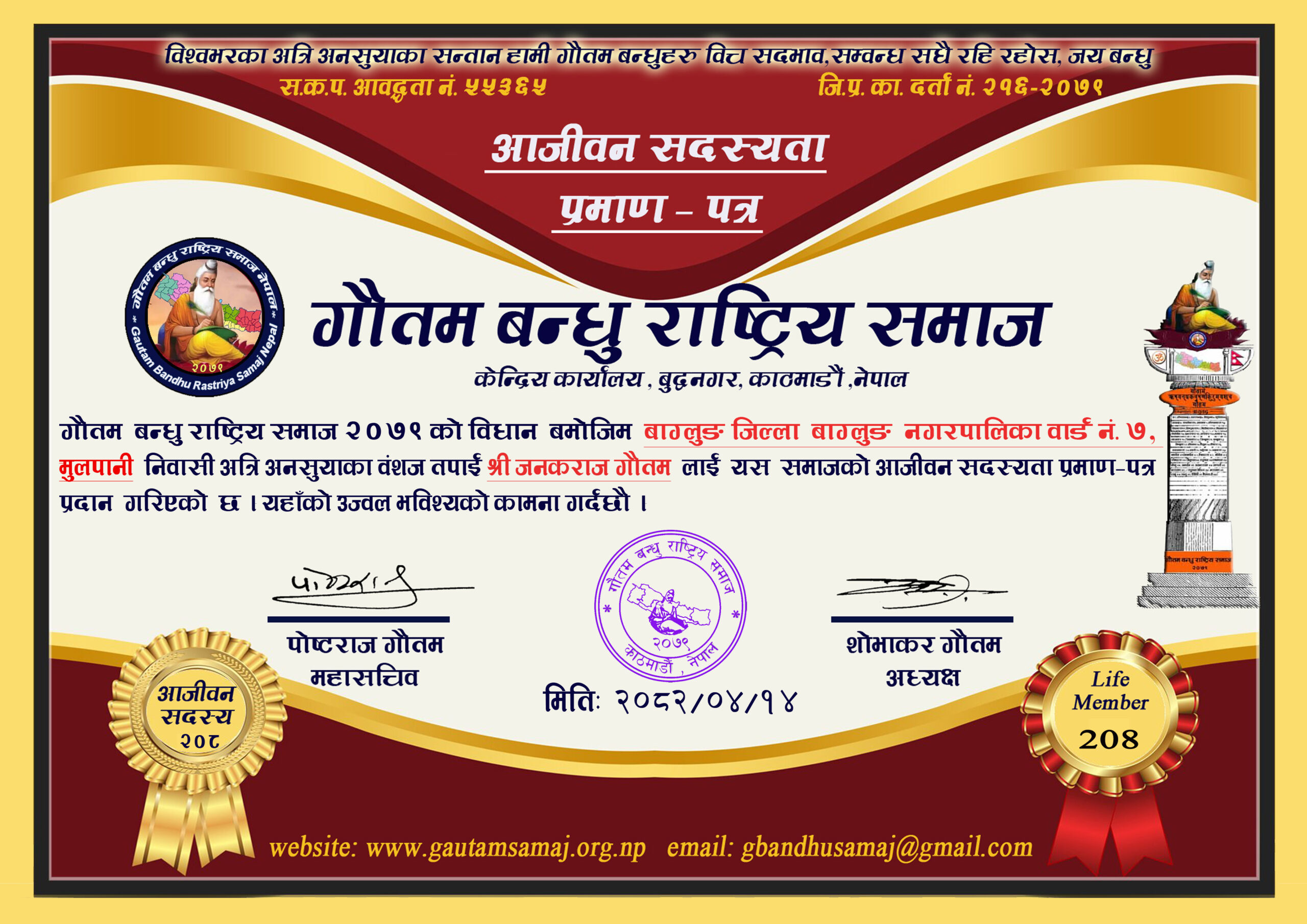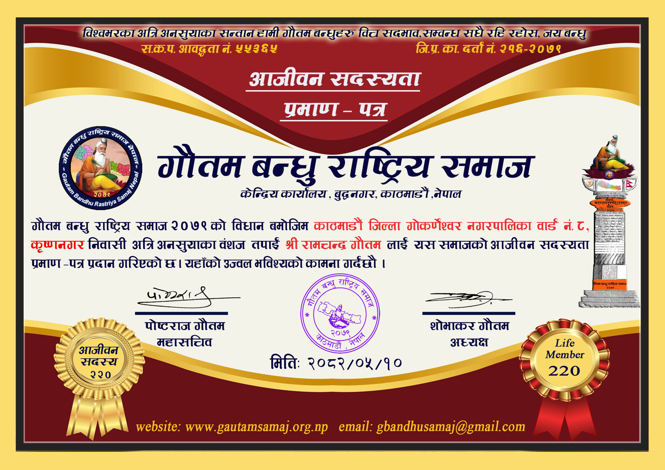 २२० रामचन्द्र गौतम गाेकर्णेश्वर नगरपालिका ८, कृष्णनगर, काठमाडौ‌ ०५/१०/२०८२