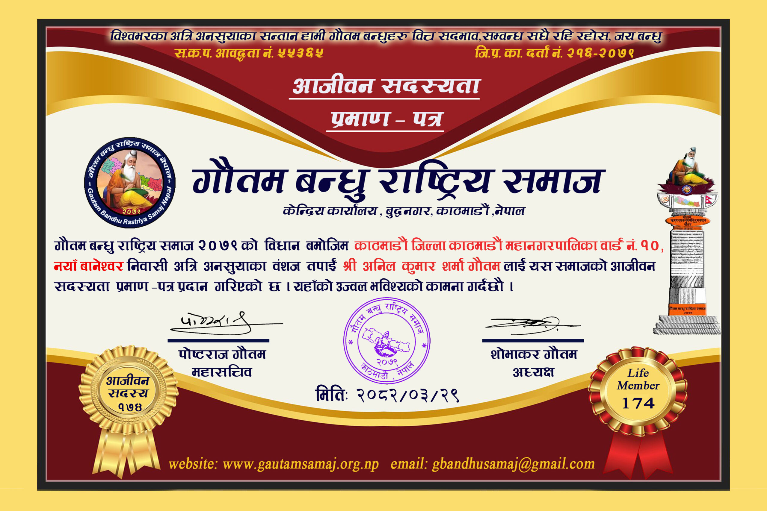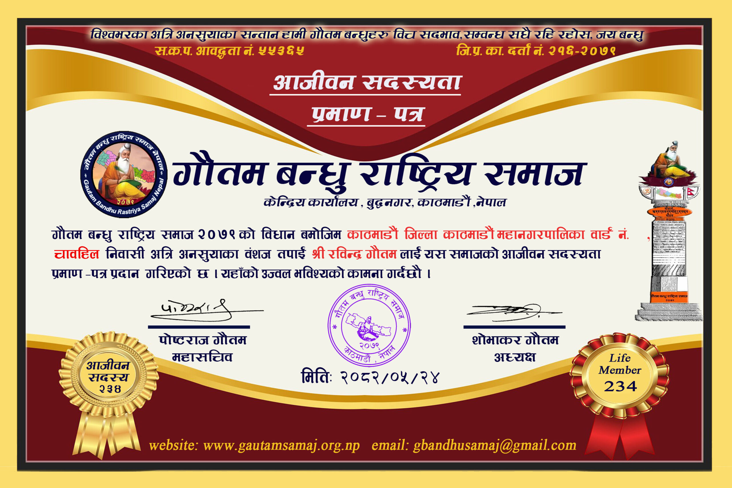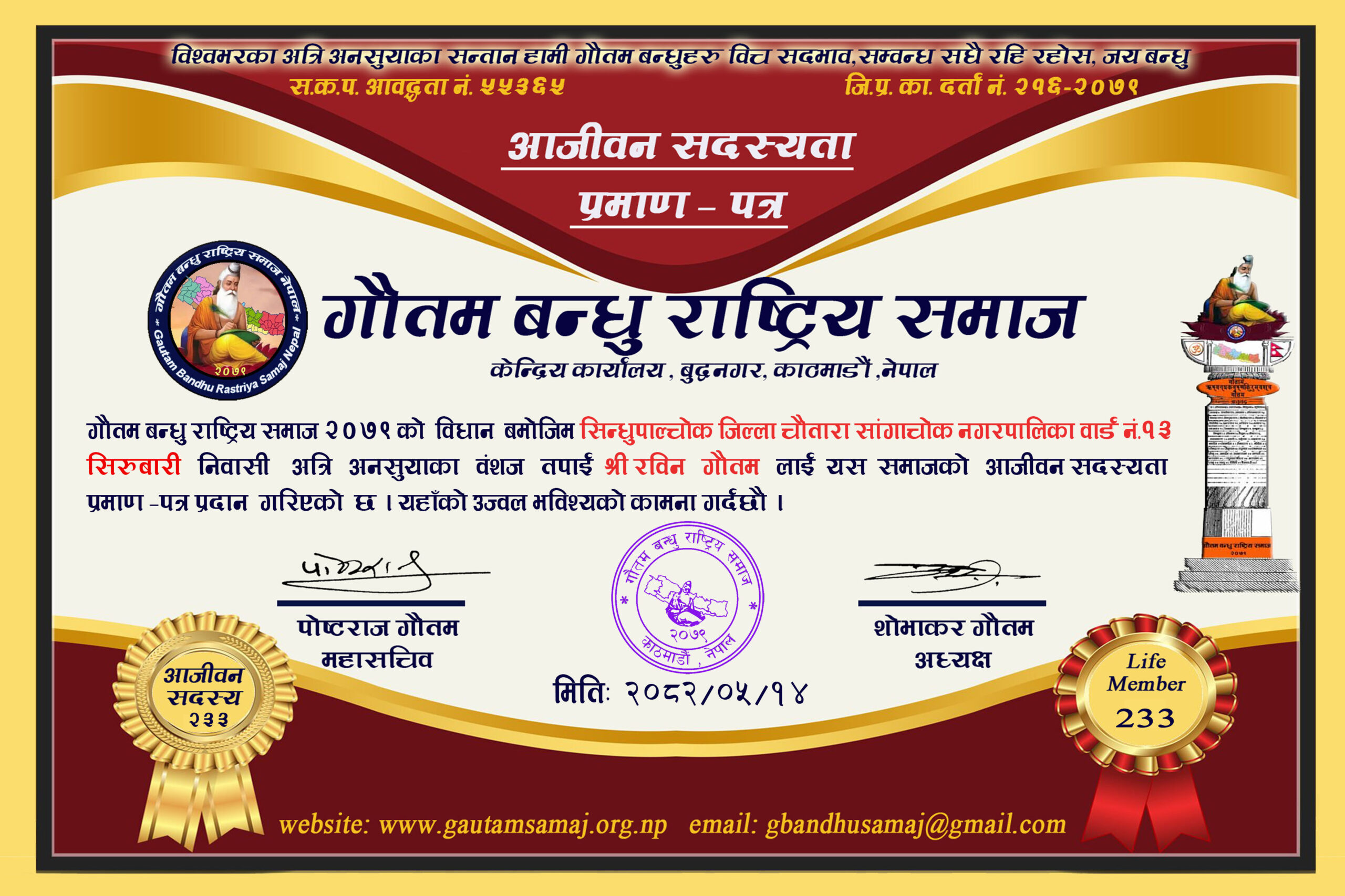 २२० रामचन्द्र गौतम गाेकर्णेश्वर नगरपालिका ८, कृष्णनगर, काठमाडौ‌ ०५/१०/२०८२