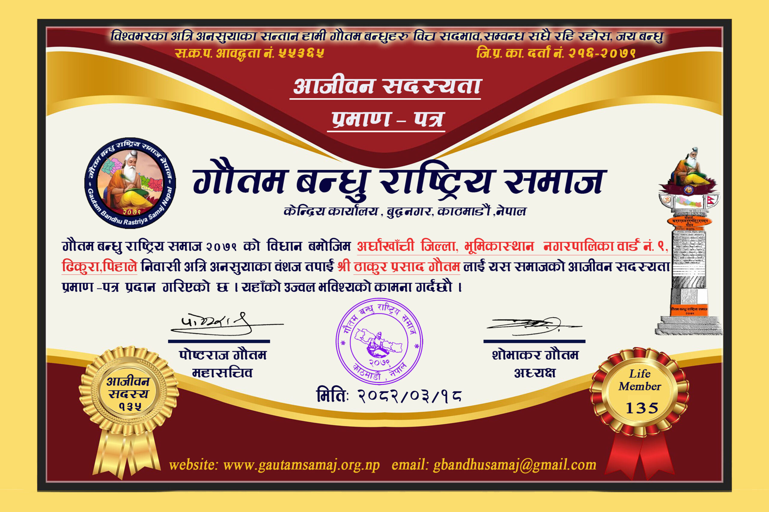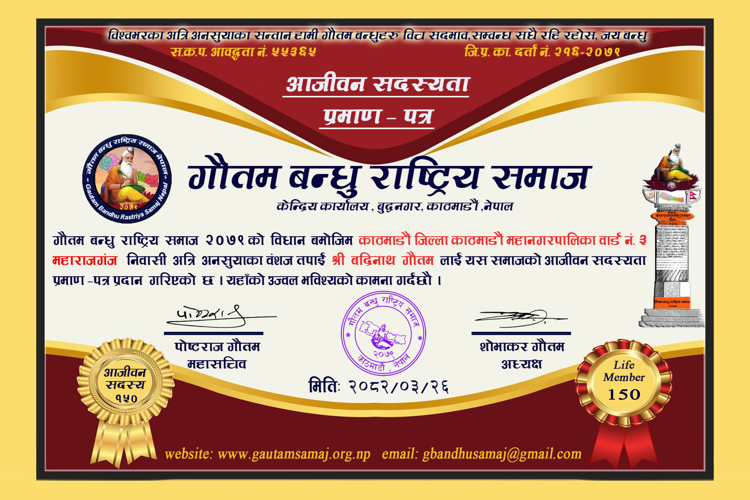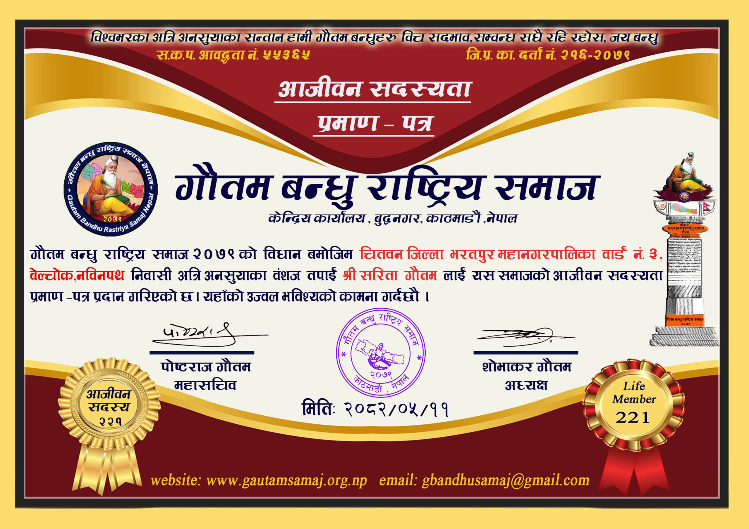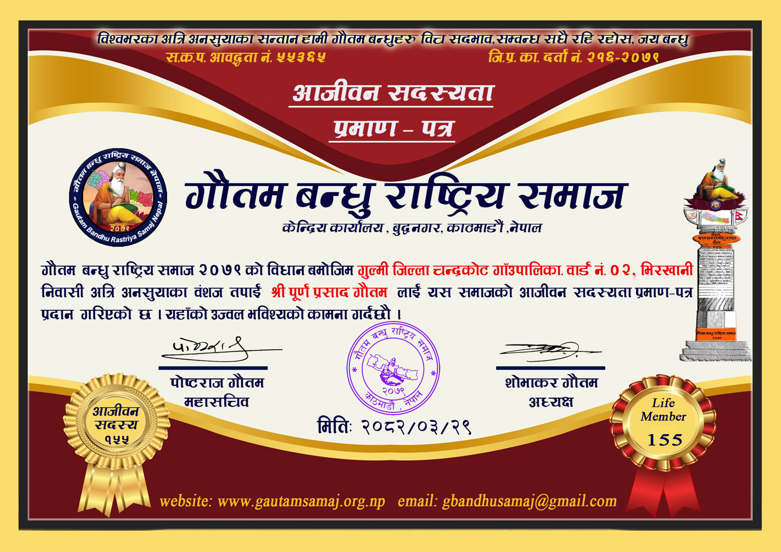 २२० रामचन्द्र गौतम गाेकर्णेश्वर नगरपालिका ८, कृष्णनगर, काठमाडौ‌ ०५/१०/२०८२