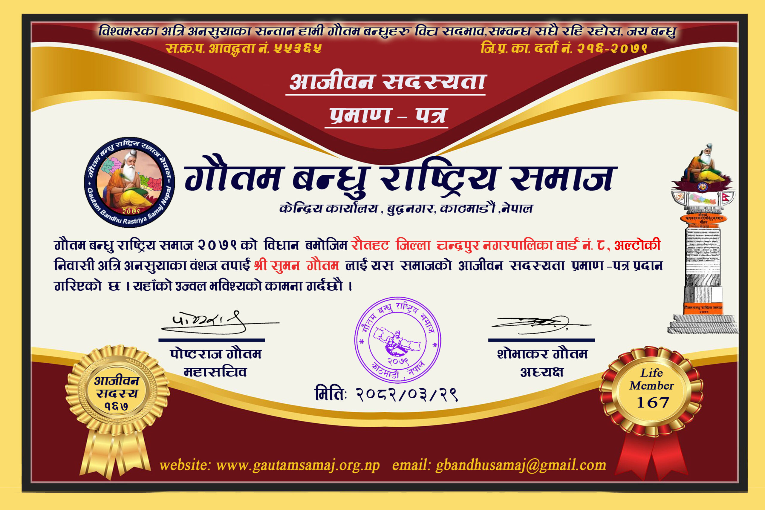 ६४ खडानन्द गौतम गोकणेश्वर ८ , काठमाडौं ०१/१६/२०७९