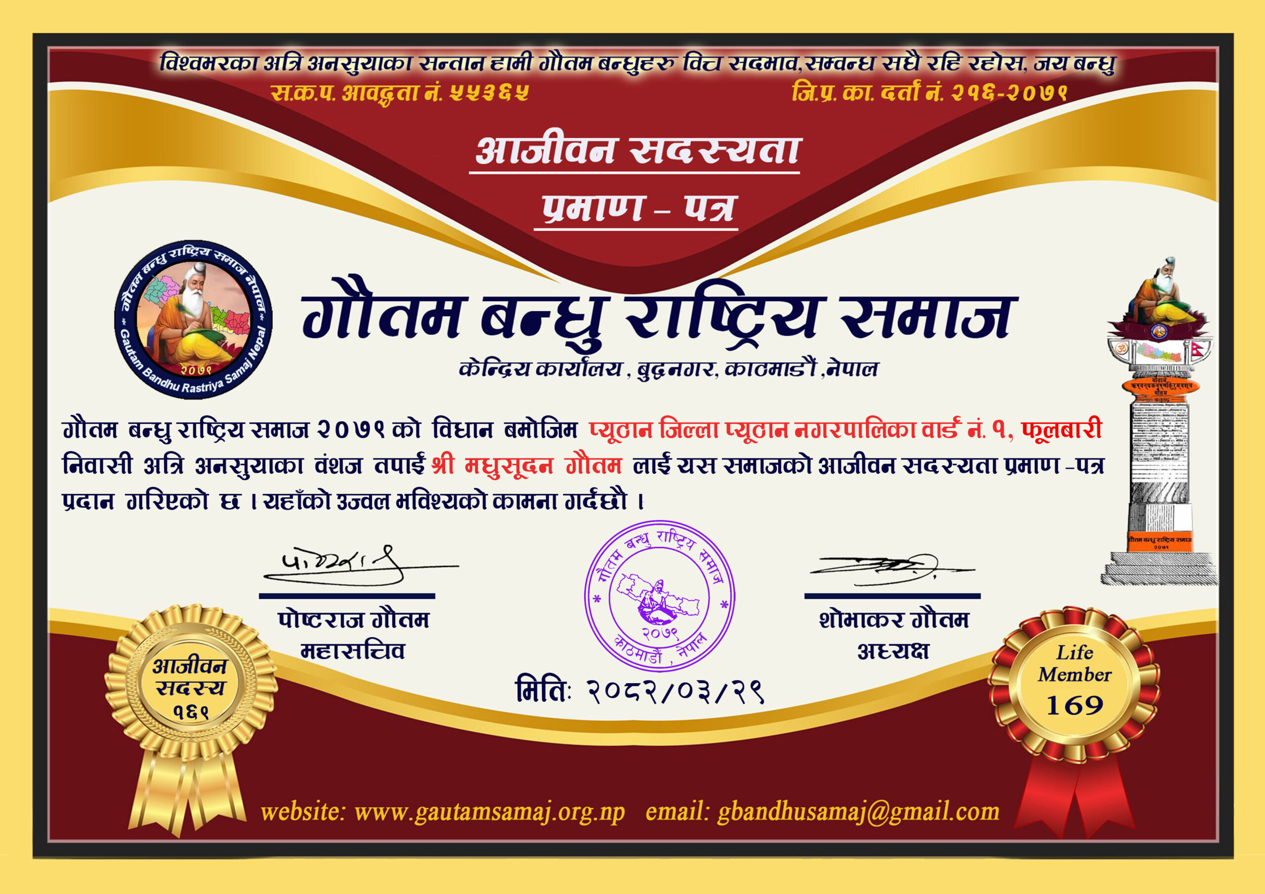 प्रकाशमणि गौतम फुङ्लिङ् न.पा. ५ ताप्लेजुङ्ग हाल कामपा २९ , अनामनगर, काठमाडौं १२/२४/२०७९
