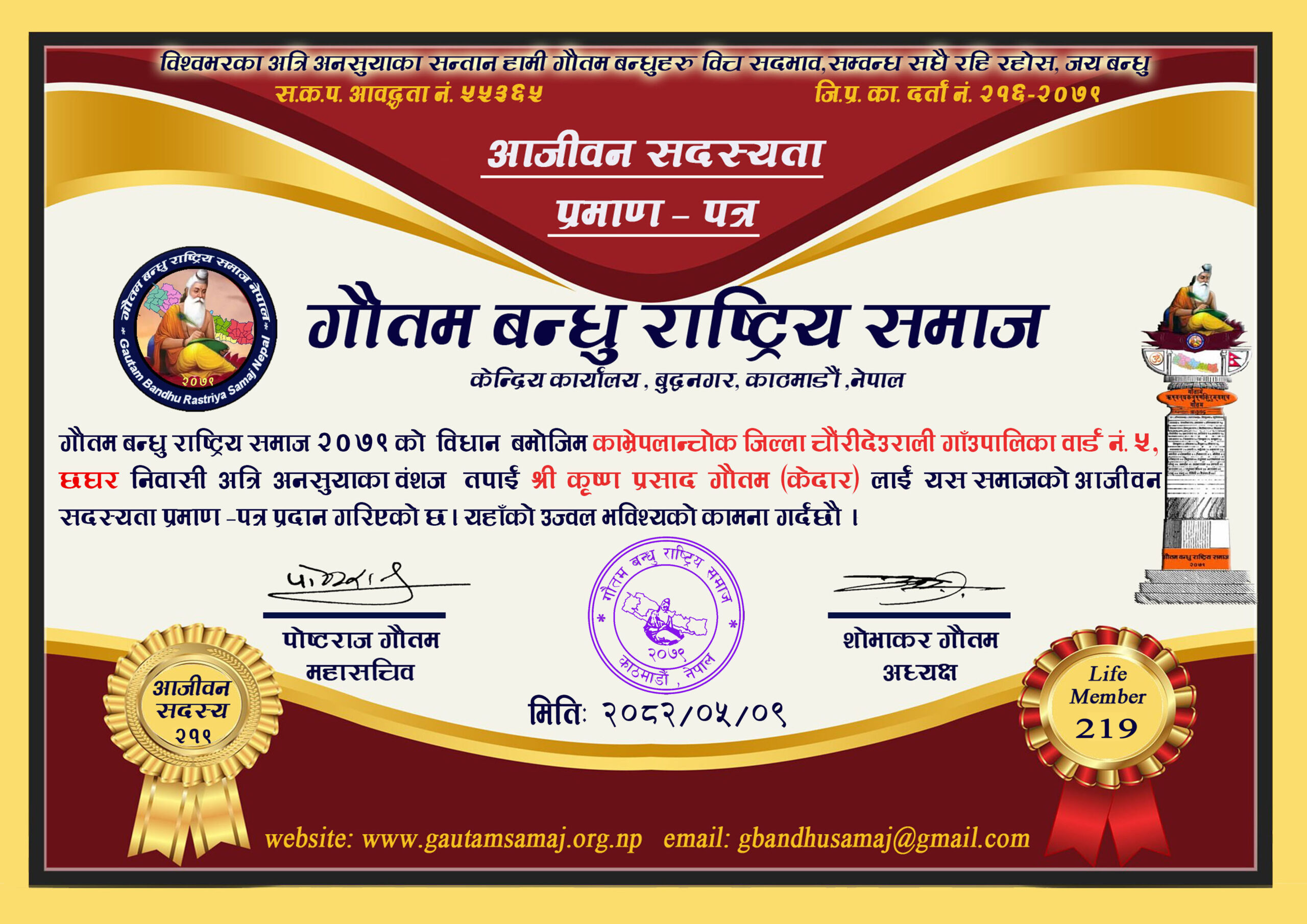 २१९ कृष्ण प्रसाद गौतम (केदार) चौरीदेउराली गाउँपालिका ५ , छघर, काभ्रेपलान्चोक ०५/९/२०८२
