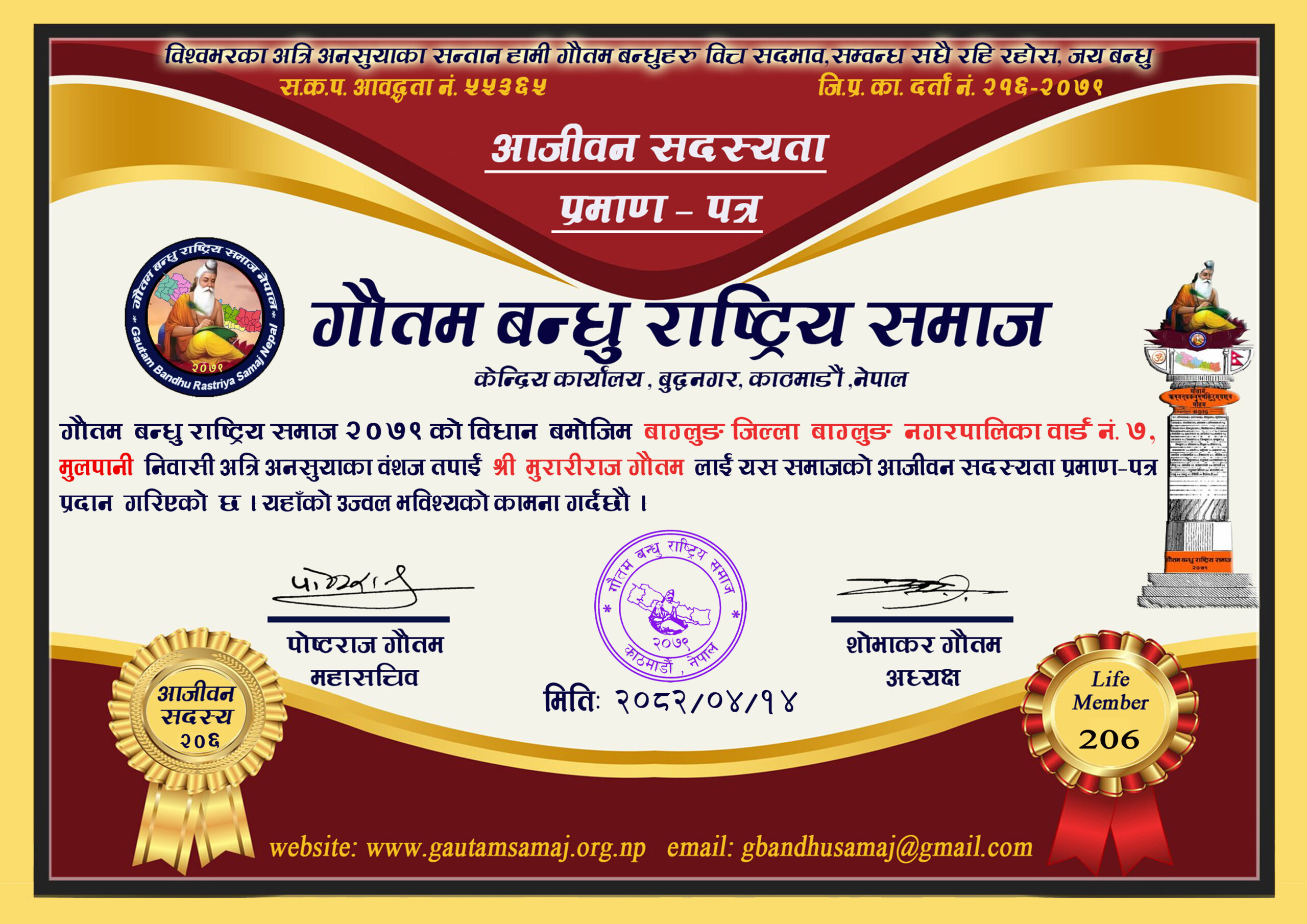 २३७ पद्मनाभ गौतम टोखा नगरपालिका ६, डाँफेबस्ती, काठमाडौ २०८२/०५/१५